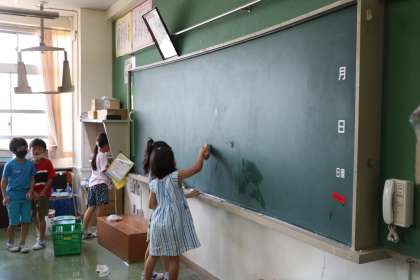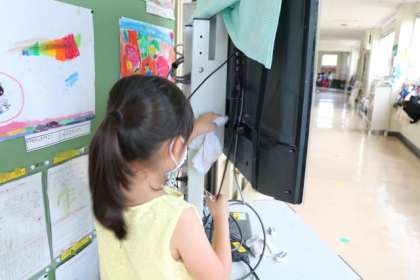 テレビの裏を拭いたり、黒板を丁寧に拭いたりする2年生の様子です。