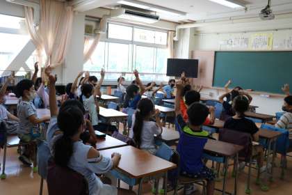「45分しっかり掃除できたと思う人?」との問いかけに、元気よく手を挙げる3年生です。
