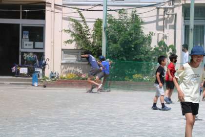 鬼ごっこの最中、ベンチに座って「ひなたぼっこ!だって鬼の先生気が付かなくて来ないんだもの。」という5年生。その次の瞬間、鬼登場です。みんなあっという間にそれぞれの方向に逃げていきました。