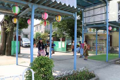 今日は正門で子供たちを迎えました。体育館までの渡り廊下にちょうちんが下がっているのを見て、「「お祭りみた〜い」と子供たちは大喜びです。