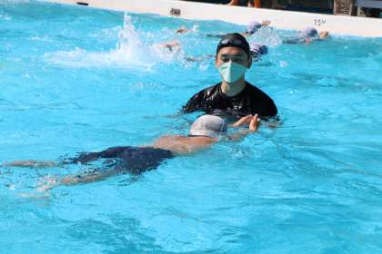 砧小学校の夏季水泳教室は、その日の当番の先生以外に、多くの先生が来てくれるので、一人一人に合った指導や声掛けができます。限られた回数ではありますがぜひ毎回参加してください。ぐんぐん上達します。