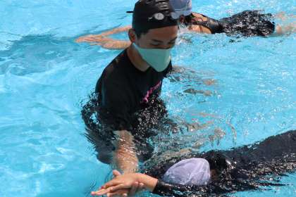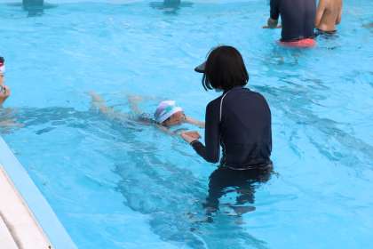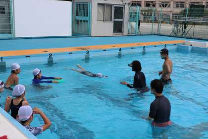 砧小学校は、当番の先生以外にたくさんの先生方が水泳指導に来てくれます。