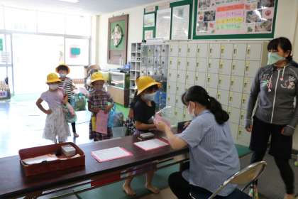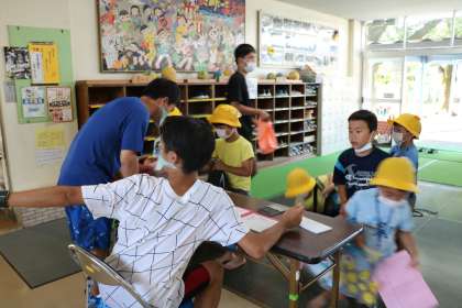 今日の水泳教室は1年生の日です。受付の様子です。いつもと違った様子に少し緊張気味ですが、担任の先生の顔を見たら笑顔がこぼれます。