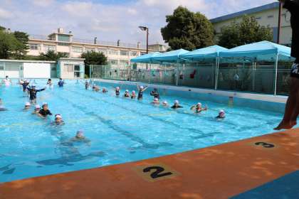 ウォーミングアップに「リズム泳」でたっぷり水と仲よしになります。低学年では特に水に慣れ、水の中で力を抜くことが大切です。少しずつ深く、少しずつ遠く、補助有から補助なしへとスモールステップで進めます。