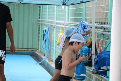 朝8時近くにすぐーるを出して申し訳ありませんでした。今日も日差しは厳しくありませんが蒸し暑いです。水泳教室途中に水分補給の時間を意図的に取らないと、1年生は自分からは飲むことがないので、あらためて水筒を持ってきていただくお願いをお出ししました。