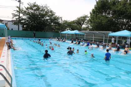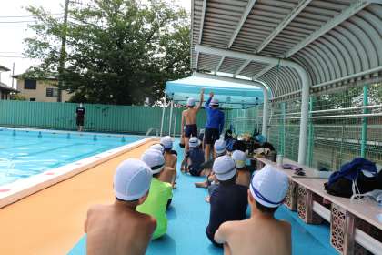 荷物を置いたら、バディーのペアを確認し、準備運動、水慣れです。