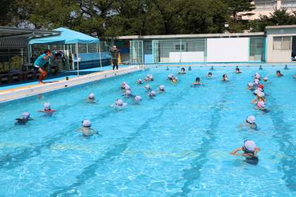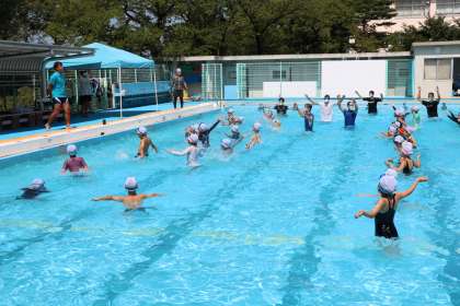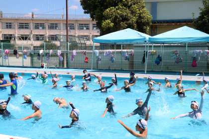 音楽に合わせて水慣れです。水の中で鼻から息を吐く、顔を上げたら口から息を吸うということを体で覚えるために、何度も楽しく繰り返します。