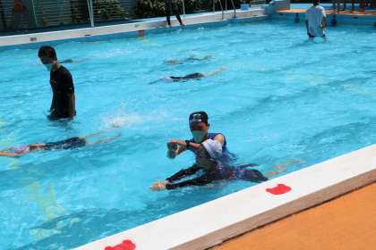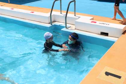最後は道具をもたずに、課題別のグループになりまとめの泳ぎです。今日やったことや前期水泳教室でやったことを一人一人確認します。