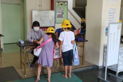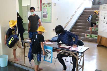 夏季水泳教室11日目・前半の部が、本日、無事終了しました。写真は2年生の受付の様子です。