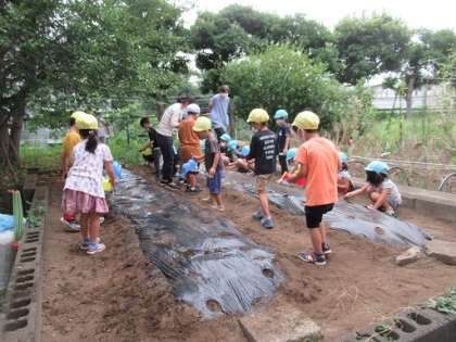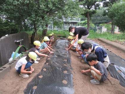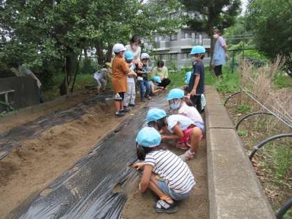 砧小学校の一角に幼稚園の畑があります。今日は年長組みんなで、大根の種をまきました。「このまえはジャガイモ堀りをしたけど、今度は大根を植えるんだね」「ジャガイモの種って小さいね」 種まきや苗植えもたくさん経験してきたので、種をなくさないようにつまんだり優しく土をかけたり、栽培活動が上手になってきました。おいしい大根になあれ!
