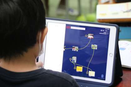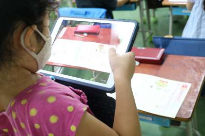 1年生の様子です。タブレットで学習した課題を写真に撮って、ロイロノートを使って先生に提出しています。
