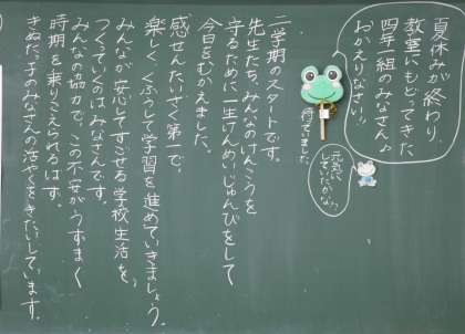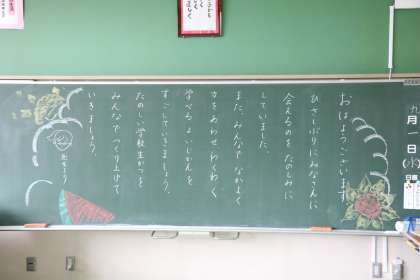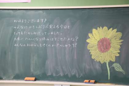 黒板に書いてある担任の先生からのメッセージの一部です。温かいメッセージから力をもらっていると思います。