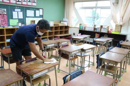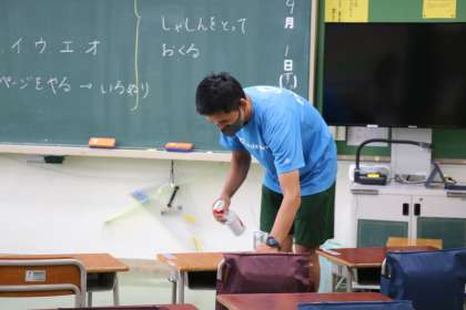 今日と明日は特別時程で4時間で下校です。子供たちが下校した後は、全員で消毒作業にあたります。