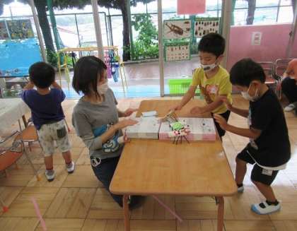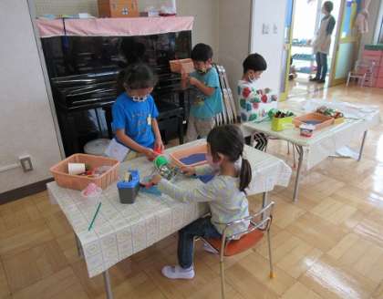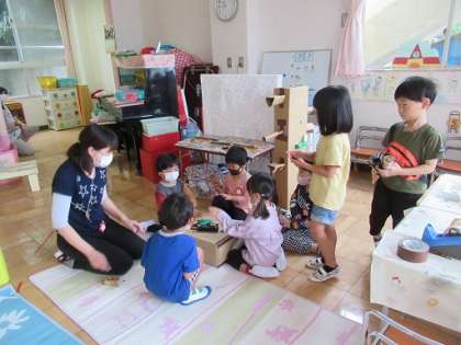 雨だったので、室内で遊びました。いろいろな材料を使って、作って遊ぶ子が多かったです。明日からは分散登園です。ご理解ご協力のほどお願いいたします。