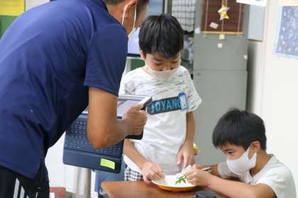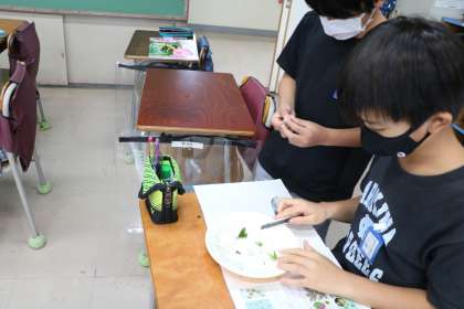 5年生理科の様子です。今日は様々な花のおしべとめしべを調べています。ていねいに花びらやがく、そのほかの部分にカッターを使い分けながら調べます。担任の先生がタブレットを持ち歩きながらBグループの子たちに実況中継をしていくようにAグループの様子を伝えます。