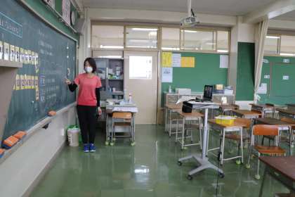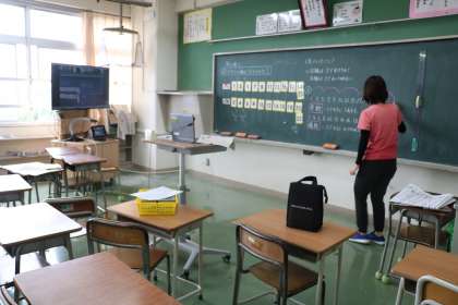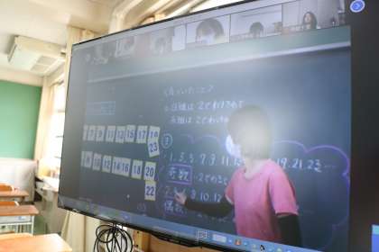 オンライン専用の授業を展開している学年もあります。子供たちの顔や反応を見ながら授業を進めたいので、撮影用のタブレットと子供の画面用タブレットと2台使って授業をしているのだそうです。画面に映っている子も先生と一緒に声を合わせて答えをつぶやく様子に、子供たちが真剣に学習に取り組んでいることがわかり、嬉しいです。