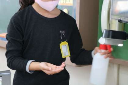アレルギー対応の必要な子に間違いがあったら大変です。調理員さんから先生に確認してお盆を手渡し、確実に配膳します。手を洗い終わり教室においてあるスプレーで消毒をする子もいます。