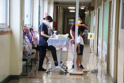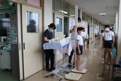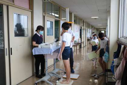 保健室に何学年も、入れ替わり集まって身体計測をするのでは、学年をまたいだ活動をしているようなもの。それならば、逆に子供たちの教室に行って身体計測をしましょう!という保健室の先生のグッドアイディアです。
