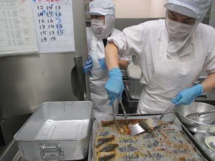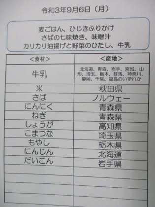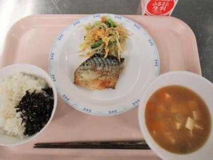 分散登校で「B」のこどもたちにとっては、今日が2学期最初の給食でした。Bの子たちもよく食べてくれていて、どのクラスもほとんど残さいはありませんでした。魚も好評で「さばが苦手だったけど、今日はおかわりしました。」と教えてくれた子がいました。さばの七味焼きはにんにく、ねぎ、しょうがなどの香味野菜としょうゆ、さとう、みりんで作ったたれにつけこんだ後、オーブンで焼いて作りました。
