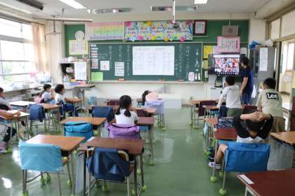 朝の会を始めるために教室では準備が始まっています。早速リモートでつながっている友達の顔を見ながら、Bグループの子供たちも嬉しそうです。