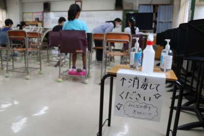 3年生音楽の様子です。夏休みに家で頑張った「石井戸囃子」のリコーダーを確認しています。教室は換気をし、入り口には消毒液が用意されています。リコーダーをふくときは、飛沫防止用のマウスピースを付けて、短時間の演奏を心掛けています。
