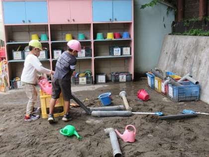 午前中はなんとかお天気がもち、外遊びをすることができました。ドッジボールや色水遊び、砂場、ごっこ遊びなど楽しみました。