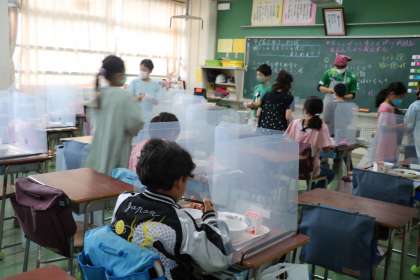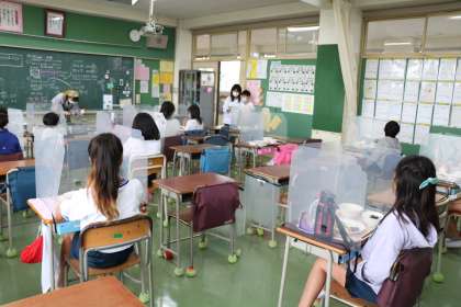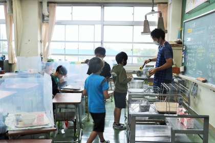 4年生の様子です。食べ始める前に減らす、増やす、食べ終わってからのおかわり…すべて手指消毒した担任の先生が一人、トングをもちます。