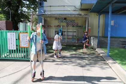 高さのあまりない竹馬を練習していた子が、今日初めて、少し高い竹馬に挑戦していました。はじめはバランスを取り辛そうでしたが、そのうち上手に歩けていたので私も嬉しくて!一緒に大喜びをしてしまいました。