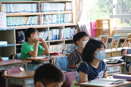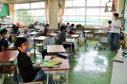 4年生理科の学習の様子です。セミの鳴き声を実際に聞き、動植物の夏から秋の変化を考えました。タブレットで聞いている子ども達にも声がきちんと届いているか、チェックしながら進めています。