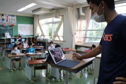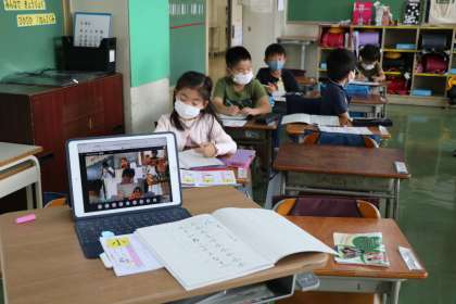 1年生の様子です。タブレットの前から担任の先生が離れたすきに、カメラに手を振ってみました。多くの子ども達が反応してくれました。勉強中にごめんなさい。でも画面越しですが顔が見えたことは何だかすぐここにいるような気持になり嬉しかったです。