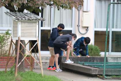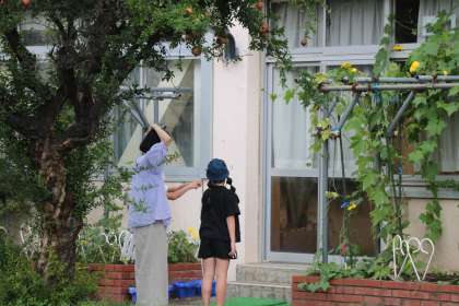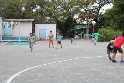 たくさんの先生が一緒に遊んでいます。先生とお話したり、遊んだりするのも学校でできる楽しいことの一つです。