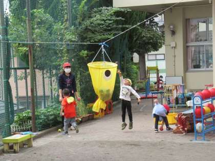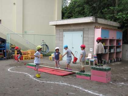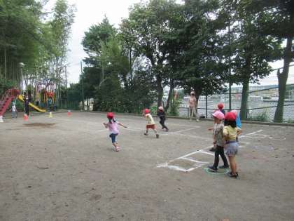 かけっこ、巧技台、玉投げ…。園庭で体をたくさん動かして遊びました。