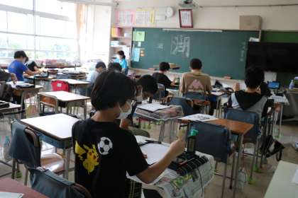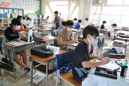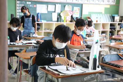 6年生書写の様子です。一文字しかも三つの部分をもつ漢字に挑戦です。部分の組み合わせでできた漢字は部分どうしの位置や大きさの関係を意識して書くと、字形が整います。