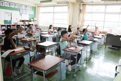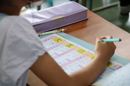 4年生新出漢字学習の様子です。Aグループの子供たちも、指で空書(そらがき)をしながら描き順を覚えているかな?