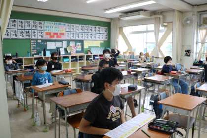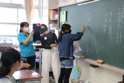 6年生の様子です。新出漢字の学習は、その漢字担当の子どもが先生になって熟語を集めたり書き順を確認したりします。Bグループの子供たちも見やすいように、先生は黒板などを映すのに一生懸命です。