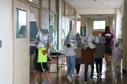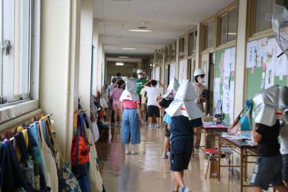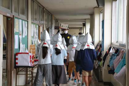 有事の時は校庭や体育館に全校児童避難しますが、今日は雨、そして緊急事態宣言中です。廊下で整列人数確認、学年で確認し職員室に報告です。その間も静かに待てる砧の子供たち。とても立派な、訓練に向かう態度でした。