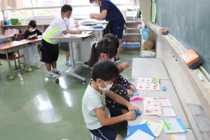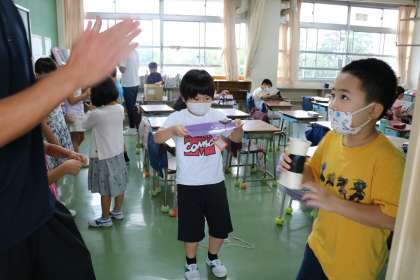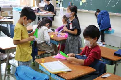 コマ回しや手作りおもちゃで楽しんだり、折り紙をしているのは