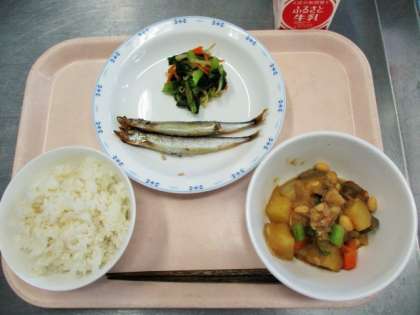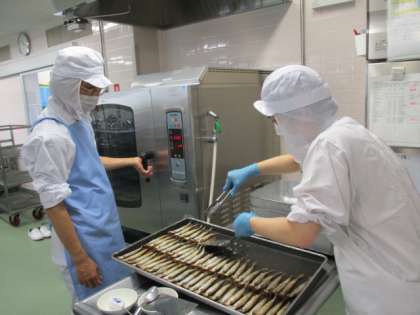 「今日の野菜おいしかったです。」と何人も教えてくれました。豆入り筑前煮と焼きシシャモも好評で今日も残さいはほとんどありませんでした。写真はししゃもを焼いている様子です。給食ではスチームコンベクションオーブンを使って焼いています。