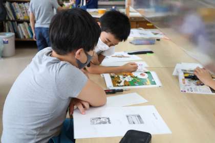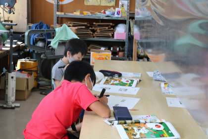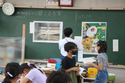 4年生図工の様子です。2枚の名画から、なんと聞こえる「音」を書き出しています。音?とびっくりしますが、子供たちの発想はやわらかです。なるほど!本当に聞こえてきそうというものばかりです。それぞれ違ったみんなが聞こえる「音」を黒板に貼りだし、交流するのも楽しそうです。こんな鑑賞の仕方もあるのですね。