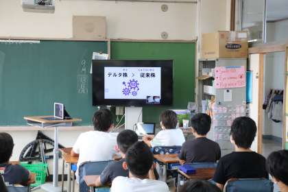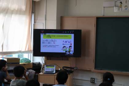写真は、映像をもとに私の話を聞いている様子です。私が校長室から話をしている間に副校長先生が撮影してくれました。どのクラスも静かに、真剣に聞いていたそうです。