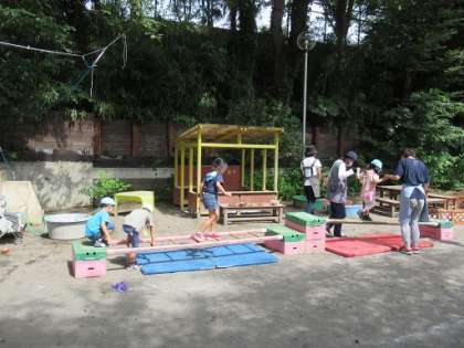 1学期に繰り返し楽しんでいた遊びを思い出し、泥だんご作り遊びや巧技台を組み立ててのごっこ遊び(ネコランドだそうです)が始まりました。分散登園が終了し久しぶりに会えた友達もいて、嬉しそうでした。