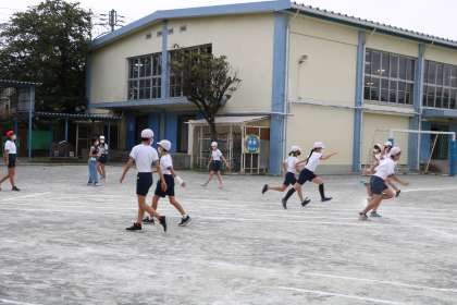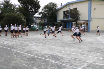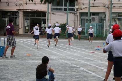 6年生体育短距離走の様子です。スタートから5m、大股で手を振って走ったり、俊敏に体を動かしてダッシュしたり全力で頑張っています。