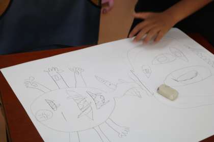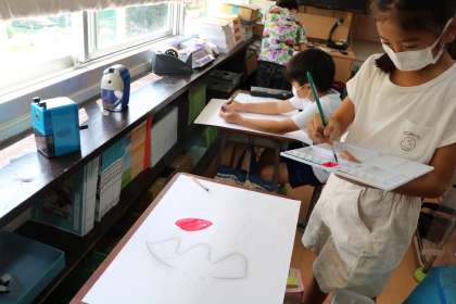 下書きに一生懸命な子、彩色に入っている子、それぞれ自分の制作に一生懸命です。友達に「うわーすごいね。これ恐竜?」と声をかけてもらうと「いや、これはね・・」と話が続きます。そんな互いの作品を知ることで、さらに自分の作品をより良くしようと意欲がわくようです。