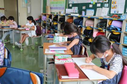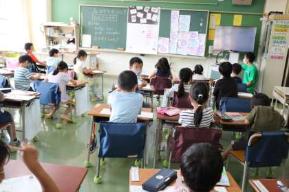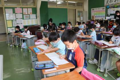 1年生算数の様子です。ノートの書きかたを教わりながら、みんなで一緒に式や答えを書いています。