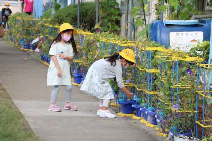 アサガオの水やりをする1年生です。「まだ花が咲くから、水やりやめられない。」と嬉しそうに自分の植木鉢まで案内してくれる子もいます。