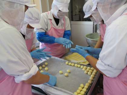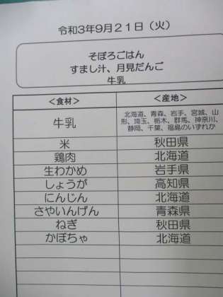 今日は十五夜の行事食です。月見だんごの黄色は生のかぼちゃを蒸かしてペーストにしたものを混ぜて作りました。まんまるの月をイメージしたお団子です。上にはみたらしあんをかけてあります。こどもたちから大人気でした。写真はお団子を丸めているところです。給食室で全部で約1300個作りました。