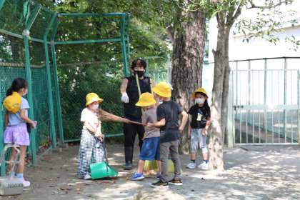主事さんの落ち葉集めをお手伝いする子。