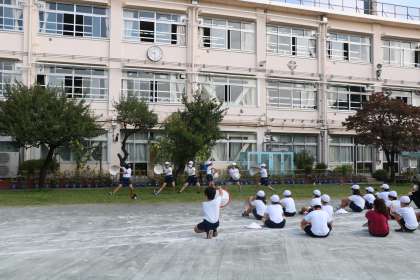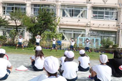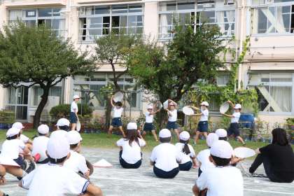 4年生体育、運動会の練習に様子です。昨日までの踊りを班ごとに練習して完璧にし、クラスの中で発表しています。