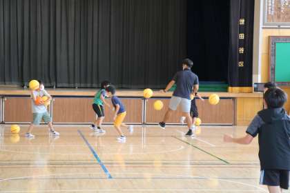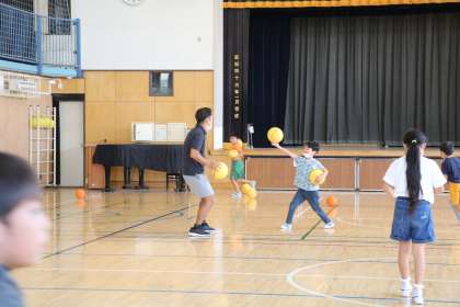 3年生が先生と一緒に、友だちと一緒に、ボールで遊んでいます。