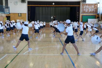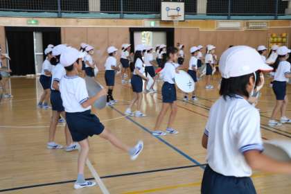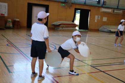 3年生体育の様子です。運動会の表現運動「花笠音頭」の練習です。先生と一緒に、友だちと確認してなど一生懸命取り組んでいます。
